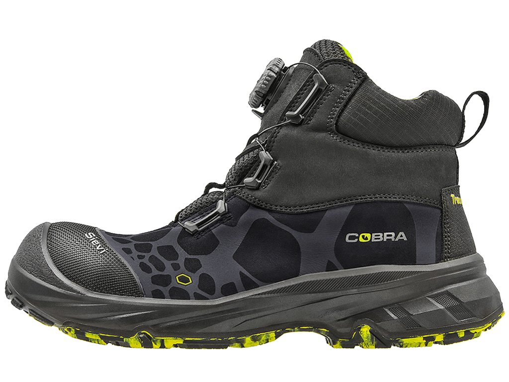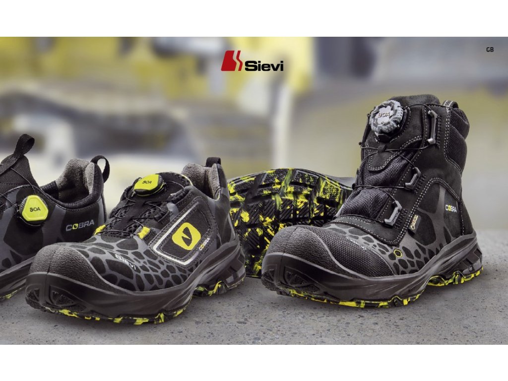 Členková obuv s kompozitnou špicou, oceľovou ochranou medzipodošvy a pamäťovou penou na podporu členku. Topánka je ľahká a vyrobená z odolného a priedušného mikrovlákna. Bezpečnostná topánka Cobra má Sievi veľmi odolnú gumenú treciu podrážku TractionPro, ktorá má priľnavosť a pružnosť aj pri meniacich sa poveternostných podmienkach. Topánka má elastický prvok FlexEnergy, ktorý zaisťuje extrémne tlmenie nárazov. Elastický prvok viaže vzniknutú kinetickú energiu tak dobre, že viac ako 55 % energie sa vráti späť do kroku. Inovatívny uťahovací mechanizmus BOA® uľahčuje rýchle obúvanie a vyzúvanie.