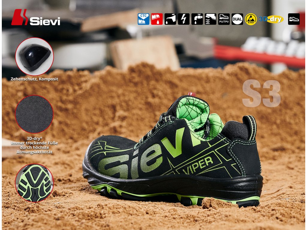 Vďaka svojej takmer bezšvovej konštrukcii je aerodynamický Sievi Viper veľmi odolný a pohodlný na používanie, bezpečná voľba pre profesionálov. Vonkajší materiál je priedušný a vodoodpudivý z mikrovlákna. Priedušnosť zvyšuje vzdušná 3D-dry podšívka. Sievi Viper je vybavená ľahkým kompozitným chráničom špičky a oceľovou ochranou spodnej časti, ktorá poskytuje najlepšiu možnú ochranu pred ostrými predmetmi. Sievi Viper vybavená dvojvrstvovou termoplastickou polyuretánovou podrážkou poskytuje najlepšiu možnú odolnosť voči mechanickému opotrebovaniu a vďaka elastickým drážkam sa obuv optimálne ohýba, vďaka čomu sa krok odvaľuje. Podošva je vyrobená z materiálu FlexStep®, ktorý zaručuje vynikajúce tlmenie nárazov. Komfotný krok počas celého pracovného dňa!